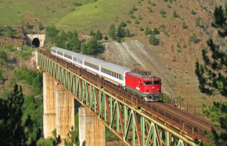 Die Bahnfahrt führt uns über den größten Binnensee aller Balkanstaaten – Skutari See Schon am Anfang der Strecke erwartet uns der 6,2 km lange Sozina Tunnel, der längste von über 100, die in den montenegrinischen Gebirge gebohrt wurden. Wir fahren am Fischerdorf Virpazar vorbei und über dem Damm, der im Jahre 1952 angelegt wurde. Rund um die Brücke erstrecken sich verschiedene Zeugen der stürmischen Geschichte Montenegros – Kirchen, Klöster, Festungen, Dörfer, sowie die üppige Vegetation, vor allem Schilfrohr. Wir erreichen Podgorica, die Hauptstadt Montenegros und nach kurzer Aufenthalt des Zuges schraubt sich der Zug in vielen kurvigen Abschnitten die Berge hoch, bis er bei Kolasin 1032 m ü.M. erreicht.